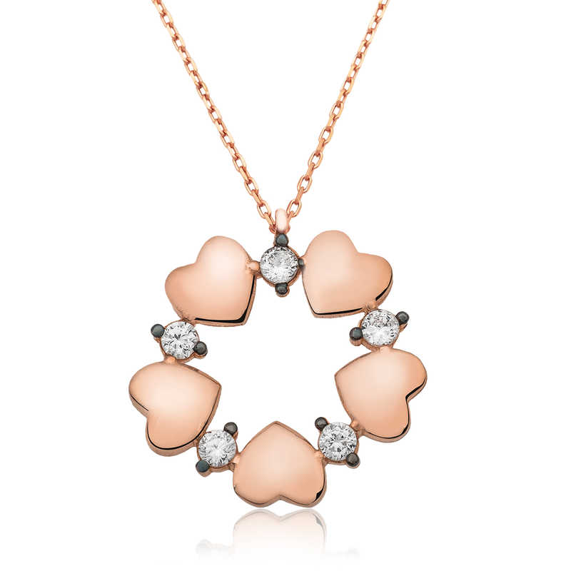 Kalp deseniyle aşkı ifade eden gümüş kalp çemberi kolye ile sevginiz, sevdiğiniz kadının teninde hayat bulsun. Genç sevgililerin özel günlerde seçebileceği gümüş kolye modeli ile sevdiğinizin boynunu aşkla süsleyin. Sizin olduğu kadar sevdiklerinizin de keyifle takacağı bu kolye en güzel hediyelerden biri olacaktır. Kalp çemberi kolye 925 ayar gümüşten imal edilmiştir. Gümüş üzerine altın rose kaplama yapılmıştır. Bu kaplamaların yapıldığı gümüş kolye modelleri parlaklığını uzun süre muhafaza eder ve oksitlenmesi gecikir. Kolye üzerinde bulunan taşlar zirkondur. Gümüş olan zincir boyu ortalama 45 cm'dir. Tüm kolye modellerinde olduğu gibi gümüş kalp çemberi kolye modeli de el emeği ile üretilmiştir. Gümüş ve değerli taşlar nedeniyle belirtilen ürün ağırlığında ± %10 sapma olabilmektedir.
