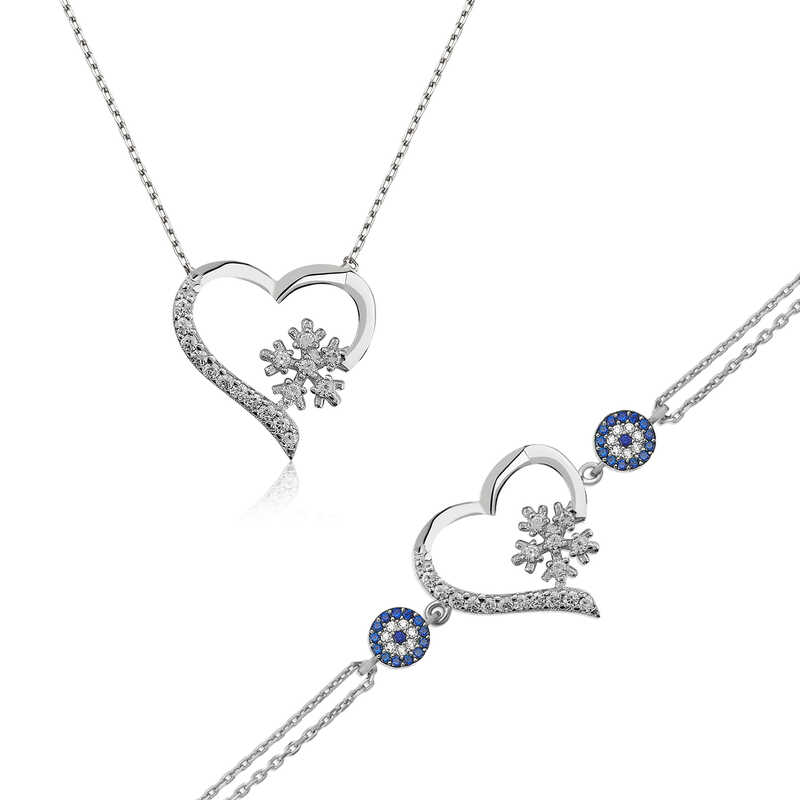 Gümüş ışıl ışıl zirkon taşlarla süslenmiş kalp içinde kar tanesi kolye ve bileklik modeli sevdiklerinizin benzersiz olduğunu anlatmaya yetecek bir hediye olacaktır. 925 ayar gümüşten imal edilmiştir. Gümüş üzerine rodyum kaplama yapılmıştır. Rodyum kaplama yapılan gümüş bayan kolye ve bileklik modelleri parlaklığını uzun süre muhafaza eder ve oksitlenmesi gecikir. Üzerinde bulunan taşlar zirkondur. Gümüş olan zincir boyu ortalama 45 cm'dir. Tüm gümüş bayan set modellerinde olduğu gibi gümüş kar tanesi kalp bayan kolye ve bileklik modeli de tamamen el emeği ile üretilmiştir. Gümüş ve değerli taşlar nedeniyle belirtilen ortalama ürün ağırlığında ± %10 sapma olabilmektedir.