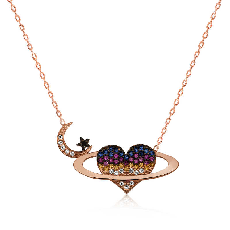 Gezegenlerin güneşin etrafında döndüğü gibi bütün varlığın; ayın, yıldızların da aşkınızın etrafında dönmesine ne dersiniz? Bu zariflikten yola çıkılarak tasarlanan bu şık kolye; doğum günü hediyesi, sevgililer günü veya veya annelere hediye olarak özel günlerde tercih edilebilecek mükemmel bir seçenektir. Kolye 925 ayar gümüşten üretilmiştir. Gümüş kolyenin zincir uzunluğu 45 cm’dir. Gümüş üzerine rose kaplama yapılmıştır. Rose kaplama yapılan kolyeler parlaklığını uzun süre muhafaza eder, gümüş rengini pembe renge dönüştürür ve oksitlenmeyi geciktirir. Tüm gümüş kolyelerde olduğu gibi gümüş kalpli gezegen kolye de el emeği ile üretilmiştir. Üzerinde bulunan taşlar zirkondur. Gümüş ve değerli taşlar nedeniyle belirtilen ürün ağırlığında ± %10 sapma olabilmektedir.