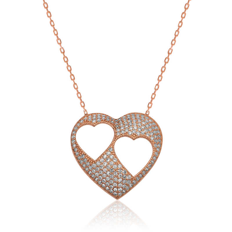 Zirkon taşlarla süslenmiş kalp kolye modeli 925 ayar gümüşten imal edilmiştir. Gümüş kolye üzerine rose altın kaplama yapılmıştır. Rose altın kaplama yapılan gümüş kalpli kolye modelleri parlaklığını uzun süre muhafaza eder ve oksitlenmesi gecikir. Bu özel kolye tasarımı sevdiklerinize sevildiğini gösterecek anlamlı ve ışıl ışıl bir hediye olacaktır. Bu özel tasarım kolye modeli üzerindeki taşlar zirkondur. Gümüş kalpli kolye ile gelecek zincir boyu ortalama 45 cm'dir. Gümüş kolye modellerinin tamamı el emeği ile üretilmiştir. Gümüş ve değerli taşlar nedeniyle belirtilen ortalama ürün ağırlığında ± %10 sapma olabilmektedir.