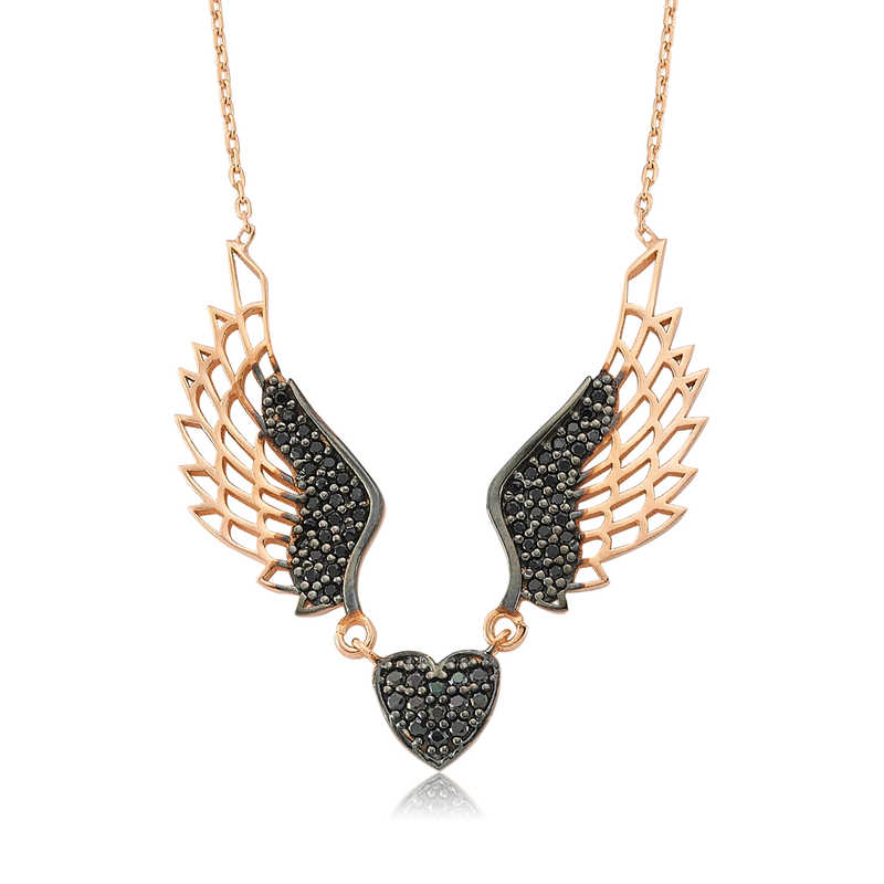 Sevdiğinizin kalbinin kanatlarınızın altında olduğunu anlatan siyah kanatlı melek kolye, duygularınızı ifade etmenizde yardımcı olacak en güzel aksesuarlardan biri olacaktır. Sevdiklerinizi sevindirebileceğiniz en anlamlı hediyelerden kanatlı melek bayan kolye 925 ayar gümüşten imal edilmiştir. Gümüş üzerine rose altın kaplama yapılmıştır. Rose altın kaplama yapılan gümüş bayan kolye modelleri parlaklığını uzun süre muhafaza eder ve oksitlenmesi gecikir. Kolye üzerinde bulunan siyah taşlar zirkondur. Gümüş olan zincir boyu ortalama 45 cm'dir. Gümüş siyah kanatlı melek bayan kolye el emeği ile üretilmiştir. Gümüş ve değerli taşlar nedeniyle belirtilen ortalama ürün ağırlığında ± %10 sapma olabilmektedir.