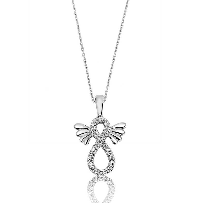 Sevgilinize sonsuz aşkı ifade etmenin en güzel ve en anlamlı yollarından biri sonsuzluk kolyesidir. Şık tasarımıyla bu özel kolye ile sevdiğinize olan sonsuz aşkınızı ifade edebilir, sonsuza kadar birlikte olacağınız mesajı verebilirsiniz. Her dönem sevilen bu sade ve şık kolyeyi; doğum günü hediyesi, sevgililer günü hediyesi veya annelere hediye olarak özel günlerde tercih edebilirsiniz. Kanatlı sonsuzluk kolye, 925 ayar gümüşten imal edilmiştir. Gümüş kolye üzerine rodyum kaplama yapılmıştır. Rodyum kaplama yapılan kolyeler parlaklığını uzun süre muhafaza eder, oksitlenmeyi geciktirir. Kolye üzerinde bulunan taşlar zirkondur. Gümüş olan zincirin boyu ortalama 45 cm'dir.Tüm gümüş kolyelerinde olduğu gibi bu gümüş kanatlı sonsuzluk kolye de tamamı el emeği ile üretilmiştir. Gümüş ve değerli taşlar nedeniyle belirtilen ortalama ürün ağırlığında ± %10 sapma olabilmektedir.