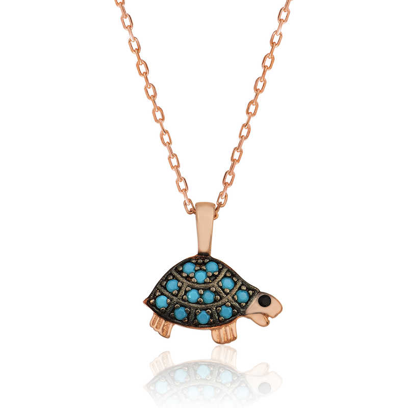 Kaplumbağalar kainatta yaş itibariyle en eski canlılardır. Bu sebepten dolayı bilgeliği sembolize eder. Bunun yanında çok ağır hareket edip sonunda amaçlarına varmaları da; sabrı sembolize eder. Bu şık kolyeyi; doğum günü hediyesi, sevgililer günü hediyesi veya annelere hediye olarak özel günlerde tercih edebilirsiniz. Kaplumbağa kolye modeli 925 ayar gümüşten imal edilmiştir. Gümüş üzerine rose altın kaplama yapılmıştır. Rose altın kaplama yapılan gümüş kolyeler parlaklığını uzun süre muhafaza eder, gümüş rengini pembe renge dönüştürür, oksitlenmesi gecikir. Gümüş kaplumbağa kolyenin üzerinde bulunan taşlar zirkondur. Tüm gümüş kolyelerde olduğu gibi gümüş kaplumbağa kolyenin de tamamı el emeği ile üretilmiştir. . Gümüş ve değerli taşlar nedeniyle belirtilen ortalama ürün ağırlığında ± %10 sapma olabilmektedir.