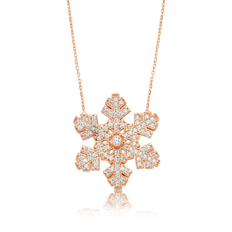 Kar yağdığında yere düşen her kar tanesi birbirinden farklıdır. Yani her bir kar tanesi eşsizdir. Sizde sevdiğinizin yeryüzünde tek olduğunu düşünüyorsanız bu kar tanesi kolye çok anlamlı bir hediye olacaktır. Kar tanesi kolye modeli 925 ayar gümüşten imal edilmiştir. Gümüş üzerine rose altın kaplama yapılmıştır. Rose altın kaplama yapılan gümüş kolye modelleri parlaklığını uzun süre muhafaza eder ve oksitlenmesi gecikir. Kolye üzerinde bulunan beyaz taşlar zirkondur. Gümüş olan zincir boyu ortalama 45 cm'dir. Gümüş kar tanesi kolye modeli diğer gümüş kolye modellerinde olduğu gibi el emeği ile üretilmiştir. Gümüş ve değerli taşlar nedeniyle belirtilen ürün ağırlığında ± %10 sapma olabilmektedir.