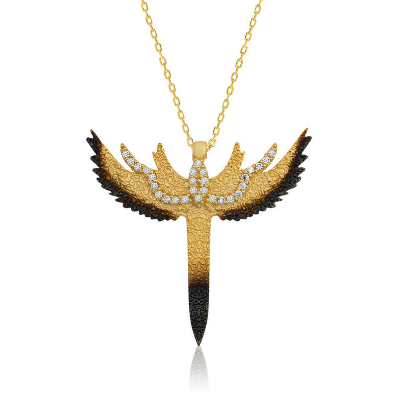 Bu şık bileklik doğum günü hediyesi, sevgililer günü hediyesi veya annelere hediye olarak özel günlerde tercih edilebilecek mükemmel bir seçenektir. Bu özel kılıç tasarımı 925 ayar gümüşten imal edilmiştir. Tasarım kılıç kolye modeli üzerinde bulunan taşlar zirkondur. Bu gümüş kolye üzerine altın kaplama yapılmıştır. Altın kaplama yapılan kolyeler parlaklığını uzun süre muhafaza eder, gümüşe sarı rengini verir, oksitlenmeyi geciktirir. Tüm gümüş kolyelerde olduğu gibi bu gümüş kılıç kolye modeli de el emeği ile üretilmiştir. Gümüş ve değerli taşlar nedeniyle belirtilen ortalama ürün ağırlığında ± %10 sapma olabilmektedir.