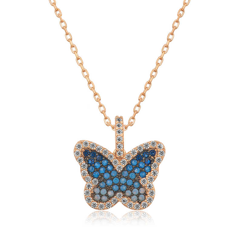 Tırtıldan kelebeğe bir dönüşüm. Rengarenk kanatları ile insanların beğenisini kazanmış bir canlıdır. Kelebek simgesi; huzur, mutluluk, gençlik ve romantizm duygularının tekrar canlanması, temiz ve saf bir sevgi değeri taşımaktadır. Bayanların genellikle kolye ve bileklikler de kullandıkları son derece zarif görüntü sunan kelebek modelleri; Yunan ve Uzak Doğu takı dünyasında popüler bir yer almakta, bedenin olgunlaşmasını temsil etmektedir. Psikolojik olarak ise kelebek modelleri için ruhun değişimi ve yenilenmesi olarak anlatılmaktadır. Bu şık kolye; doğum günü hediyesi, sevgililer günü veya özel günlerde tercih edilebilecek mükemmel bir seçenektir. Kolye 925 ayar gümüşten üretilmiştir. Gümüş üzerine rose kaplama yapılmıştır.Rose kaplama yapılan kolyeler parlaklığını uzun süre muhafaza eder, gümüş rengini pembe renge dönüştürür ve oksitlenmeyi geciktirir. Tüm gümüş kolyelerde olduğu gibi gümüş mavi kelebek kolye de el emeği ile üretilmiştir. Üzerinde bulunan taşlar zirkondur. Gümüş ve değerli taşlar nedeniyle belirtilen ürün ağırlığında ± %10 sapma olabilmektedir.