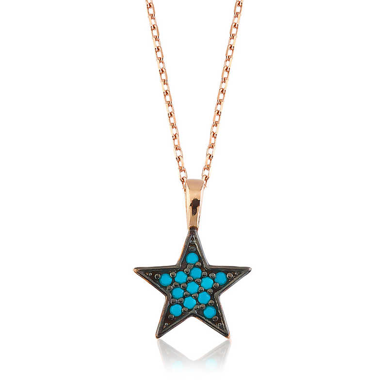 Gecenin parlak ışıltısını anımsatan yıldız, sembolik olarak evrenin sonsuzluğunu, uzaktaki bir noktayı ifade eder. Parıltının, ışığın, aydınlığın ve umudun sembolüdür. Her insan özel, her sevilen eşsizdir. Eşsiz sevginin ömür boyu sürecek birlikteliğin simgesi mavi yıldız kolye ile sevdiklerinizi mutlu etmeye ne dersiniz. Kolye 925 ayar gümüşten imal edilmiştir. Gümüş üzerine rose kaplama yapılmıştır. Rose kaplama yapılan ürünler parlaklığını uzun süre muhafaza eder, gümüş rengini pembe renge dönüştürür ve oksitlenmeyi geciktirir. Kolye üzerinde bulunan taşlar firuzedir. Gümüş kolye modellerinin tamamında olduğu gibi gümüş mavi yıldız kolye de modeli de el emeği ile üretilmiştir. Gümüş ve değerli taşlar nedeniyle belirtilen ortalama ürün ağırlığında ± %10 sapma olabilmektedir.
