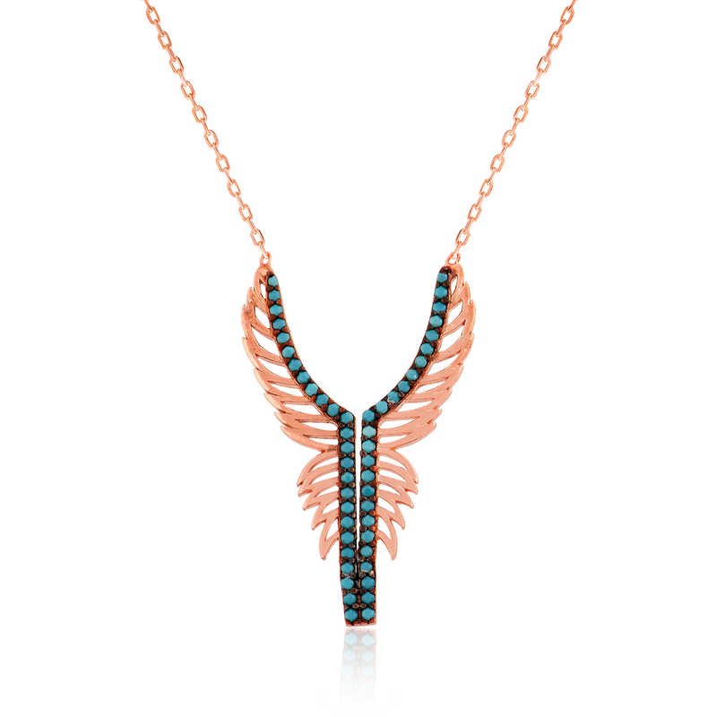 Melekler saflığın ve temizliğin simgeleridir. Bu nedenle melek kolye hediye edilen kişiye melek kadar saf ve temiz olduğu mesajı verilmektedir... Bu özel melek kanadı tasarımı 925 ayar gümüşten imal edilmiştir... Tasarım melek kanadı kolye üzerinde bulunan taşlar zirkondur. Bu gümüş kolye üzerine rose kaplama yapılmıştır. Rose kaplama yapılan tüm kolyeler parlaklığını uzun süre muhafaza eder, gümüşe pembe rengi verir. Tüm gümüş kolyelerde olduğu gibi bu gümüş melek kanadı kolye de el emeği ile üretilmiştir. Gümüş ve değerli taşlar nedeniyle ürün ağırlığında ± %10 sapma olabilmektedir.