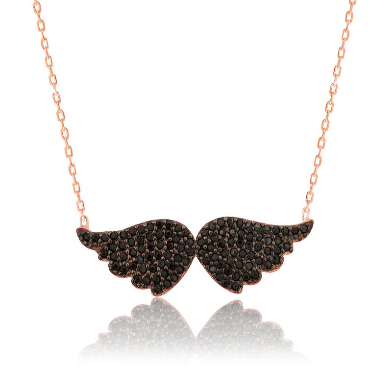 Melekler saflığın ve temizliğin simgeleridir. Bu nedenle melek kolyesi hediye edilen kişiye melek kadar saf ve temiz olduğu mesajı verilmektedir... Bu özel melek kanadı tasarımı da 925 ayar gümüşten imal edilmiştir... Tasarım melek kanadı kolye üzerinde bulunan taşlar zirkondur. Kolyenin zincir uzunluğu 45 cm’dir. Zinciri de gümüşten üretilmiştir. Bu gümüş kolye üzerine rose kaplama yapılmıştır. Rose kaplama yapılan ürünler parlaklığını uzun süre muhafaza eder, gümüş rengini pembe renge dönüştürür ve oksitlenmeyi geciktirir. Tüm gümüş kolye modellerimizde olduğu gibi bu gümüş melek kanadı kolye modelimiz de el emeği ile üretilmiştir. Gümüş ve değerli taşlar nedeniyle ürün ağırlığında ± %10 sapma olabilmektedir.