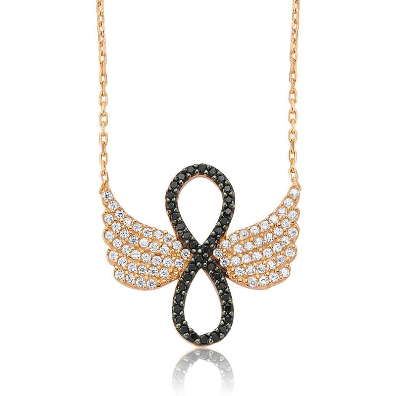 Sonsuz bağlılık, sonsuz sevgi, sonsuz güven, sonsuza kadar sürecek aşkı anlatmanın en güzel yollarından biri sonsuzluk sembolüdür. Sevgilinize hediye edeceğiniz bu özel kolye ile ona olan sonsuz aşkınızı sevginizi ifade edebilir sonsuza kadar birlikte olacağınız mesajı verebilirsiniz. Melek kanadı sonsuzluk bayan kolye 925 ayar gümüşten imal edilmiştir. Gümüş üzerine rose kaplama yapılmıştır. Rose kaplama yapılan gümüş bayan kolye modelleri parlaklığını uzun süre muhafaza eder ve oksitlenmesi gecikir. Kolye üzerinde bulunan taşlar zirkondur. Gümüş olan zincir boyu ortalama 45 cm'dir. Tüm gümüş bayan kolye modellerinde olduğu gibi gümüş melek kanadı sonsuzluk bayan kolye de el emeği ile üretilmiştir. Gümüş ve değerli taşlar nedeniyle belirtilen ürün ağırlığında ± %10 sapma olabilmektedir.