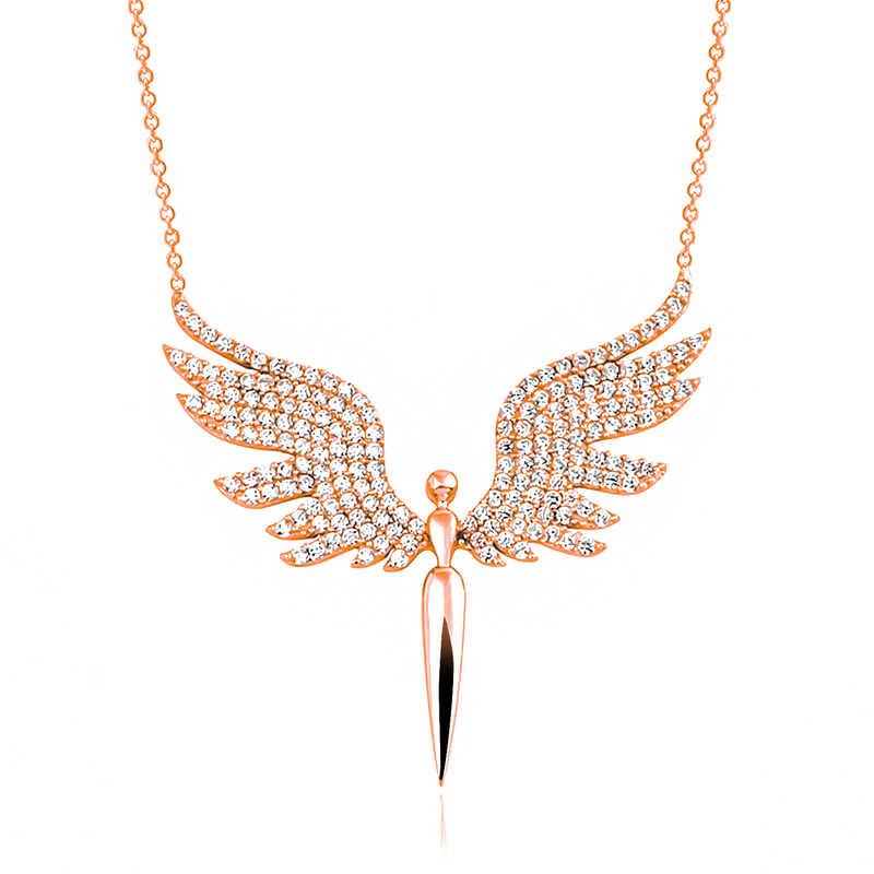 Kolye, 925 ayar gümüşten imal edilmiştir. Gümüş üzerine rose kaplama yapılmıştır. Rose kaplama yapılan ürünler parlaklığını uzun süre muhafaza eder ve oksitlenmesini geciktirir. Tüm gümüş kadın kolyelerde olduğu gibi bu gümüş mikail meleği kadın kolye de tamamı el emeği ile üretilmiştir. Gümüş ve değerli taşlar nedeniyle belirtilen ortalama ürün ağırlığında ± %10 sapma olabilmektedir.