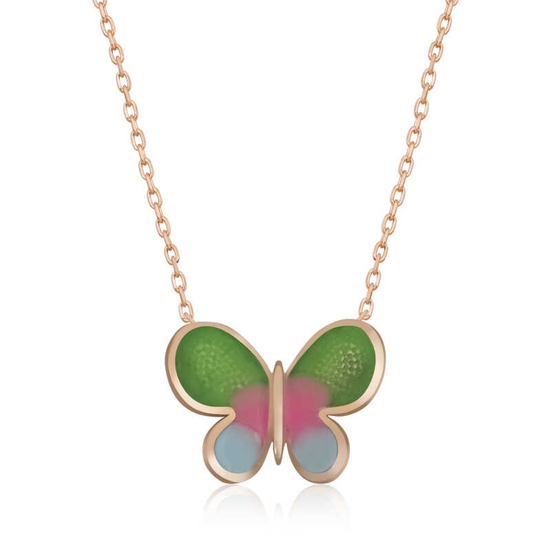 Özgürlüğü masumiyeti ve saflığı simgeleyen kelebekler, tertemiz sevginin ve aşkın ifadesidir. Bahar kelebekleri kolye anlam itibari ile aşkın küçük bir kıvılcım ile başladığı daha sonra büyük bir sabır ile büyüdüğü ve en sonunda ilan-ı aşkı ifade eder. Sizin olduğu kadar sevdiklerinizin de keyifle takacağı minimal kelebek bayan kolye en güzel hediyelerden biri olacaktır. Kolye 925 ayar gümüşten imal edilmiştir. Gümüş üzerine rose kaplama yapılmıştır. Rose kaplama yapılan gümüş bayan kolyeler parlaklığını uzun süre muhafaza eder, ve oksitlenmeyi geciktirir. Kolye üzerinde bulunan renkler mine işlemesidir. Gümüş olan zincir boyu ortalama 45 cm'dir. Tüm gümüş bayan kolyelerde olduğu gibi gümüş minimal kelebek bayan kolye de el emeği ile üretilmiştir. Gümüş ve değerli taşlar nedeniyle belirtilen ürün ağırlığında ± %10 sapma olabilmektedir.