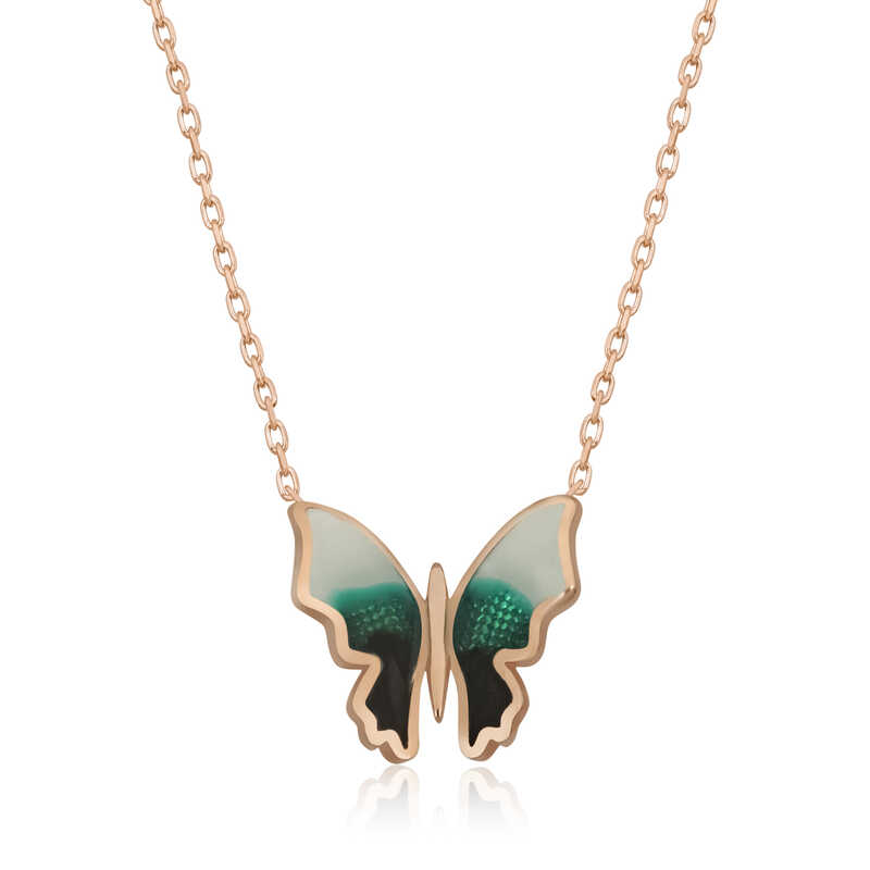 Özgürlüğü masumiyeti ve saflığı simgeleyen kelebekler, tertemiz sevginin ve aşkın ifadesidir. Bahar kelebekleri kolye anlam itibari ile aşkın küçük bir kıvılcım ile başladığı daha sonra büyük bir sabır ile büyüdüğü ve en sonunda ilan-ı aşkı ifade eder. Sizin olduğu kadar sevdiklerinizin de keyifle takacağı minimal kelebek bayan kolye en güzel hediyelerden biri olacaktır. Kolye 925 ayar gümüşten imal edilmiştir. Gümüş üzerine rose kaplama yapılmıştır. Rose kaplama yapılan gümüş bayan kolyeler parlaklığını uzun süre muhafaza eder, ve oksitlenmeyi geciktirir. Kolye üzerinde bulunan renkler mine işlemesidir. Gümüş olan zincir boyu ortalama 45 cm'dir. Tüm gümüş bayan kolyelerde olduğu gibi gümüş minimal kelebek bayan kolye de el emeği ile üretilmiştir. Gümüş ve değerli taşlar nedeniyle belirtilen ürün ağırlığında ± %10 sapma olabilmektedir.