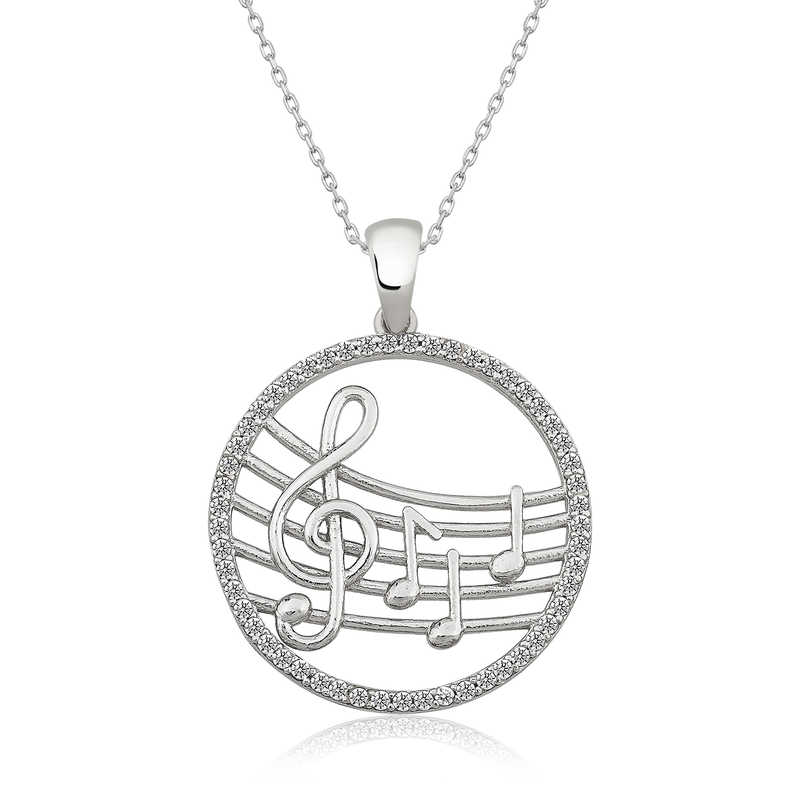 Müzik; diğer sanat dallarından farklı olarak işitsel, zaman içinde ilerleyen müzikal seslerle düşünceleri aktaran ve duygulara hitap eden ruhsal bir sanattır. Notalardan oluşan müzik temalı kolye gösteriş ve şıklığın peşinde olan kadınlar için tasarlanmıştır. Bu şık modeli; doğum günü hediyesi, sevgililer günü hediyesi olarak özel günlerde tercih edebilirsiniz. Gümüş müzik temalı bayan kolye, 925 ayar gümüşten imal edilmiştir. Gümüş üzerine rodyum kaplama yapılmıştır. Rodyum kaplama yapılan gümüş bayan kolyeler parlaklığını uzun süre muhafaza eder, oksitlenmesi gecikir. Üzerinde bulunan taş zirkondur. Tüm gümüş bayan kolyelerde olduğu gibi bu gümüş müzik temalı bayan kolye modeli de el emeği ile üretilmiştir. Gümüş ve değerli taşlar nedeniyle belirtilen ortalama ürün ağırlığında ± %10 sapma olabilmektedir.