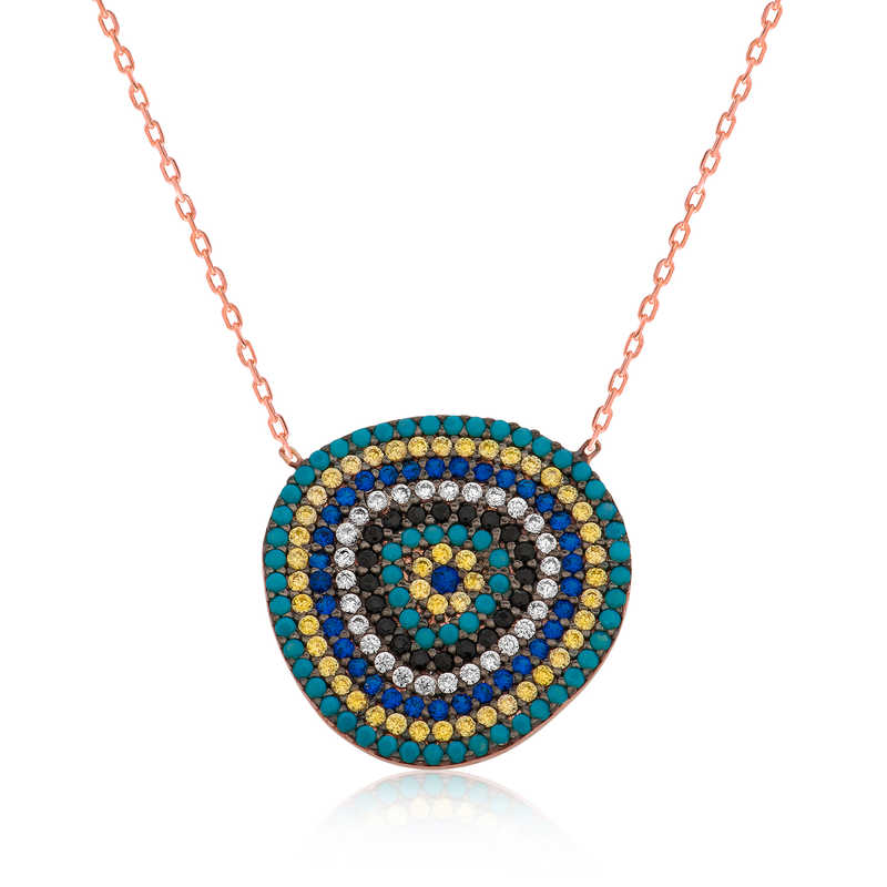 Nazar boncuğunu insanlar uzun yıllardan beri kötü bakıştan korunmak için kullanmışlardır. Kötü bakışların insanlar üzerinde olumsuz etki oluşturmasına karşı bir önlemdir nazar boncuğu. Bu sebeptendir ki insanlar sevdiklerini korumak için nazar boncuğu takmaktadır. Bu nazar kolye de şıklığı ve zarafeti yansıtıyor. Her dönem sevilen ve şıklığından ödün vermeyen bu modeli; doğum günü hediyesi, sevgililer günü hediyesi veya annelere hediye olarak özel günlerde tercih edebilirsiniz. Gümüş nazar kolye, 925 ayar gümüşten imal edilmiştir. Gümüş kolye üzerine rose kaplama yapılmıştır. Rose kaplama yapılan kolyeler parlaklığını uzun süre muhafaza eder, gümüş rengini pembe renge dönüştürür ve oksitlenmeyi geciktirir. Zincir boyu ortalama 45 cm'dir. Tüm gümüş kolye modellerinde olduğu gibi bu gümüş nazar kolye modeli de tamamı el emeği ile üretilmiştir. Gümüş ve değerli taşlar nedeniyle belirtilen ortalama ürün ağırlığında ± %10 sapma olabilmektedir.