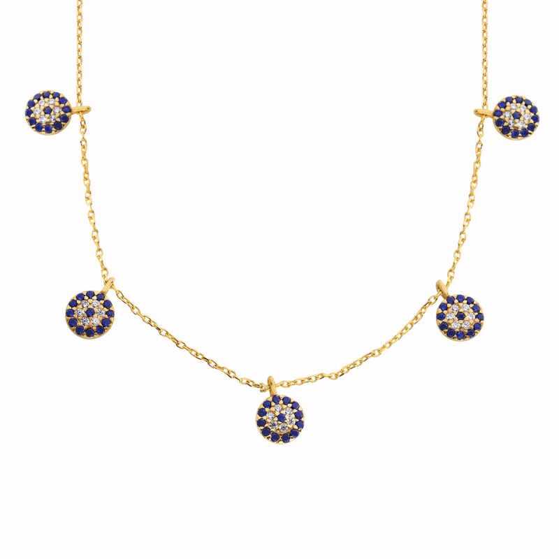 Gümüş nazar boncuğu sade tasarımıyla günlük hayatta rahatlıkla kullanabileceğiniz bir model. Nazar boncuğu sizi kem gözlerden alıkoyar. Bu şık gümüş kolye modeli üzerinde bulunan taşlar zirkondur. Gümüşün üzerine oksitlenmesi geciksin ve parlaklığını uzun süre muhafaza etsin diye gold kaplama yapılmıştır. Tamamen gümüş olan zincir uzunluğu ortalama 45 cm’dir. Bu nazarlı şans kolye modeli el emeği ile üretilmiştir. Gümüş ve değerli taşlar nedeniyle belirtilen ortalama ürün ağırlığında ± %10 sapma olabilmektedir.