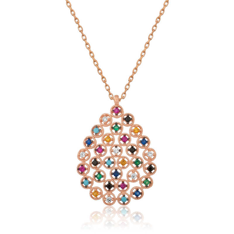 Gündelik hayatta, özel günler ve gecelerde tercih edebileceğiniz renkli ışıl ışıl taşları ile yıldızları anımsatan bu kolyeyi severek kullanacaksınız. Şık bir görünüm yakalamak isteyen tüm kadınlara hitap eden, modası geçmeyecek olan renkli taşlı gümüş damla kolye sizleri bekliyor. Gümüş renkli taşlı damla kolye; doğum günü hediyesi, sevgililer günü hediyesi veya annelere hediye olarak özel günlerde tercih edilebilecek mükemmel bir seçenektir. Renkli taşlı damla kolye 925 ayar gümüşten imal edilmiştir. Gümüş üzerine rose kaplama yapılmıştır. Rose kaplama yapılan kolyeler parlaklığını uzun süre muhafaza eder, gümüşü pembe renge dönüştürür ve oksitlenmeyi geciktirir. Üzerinde bulunan taşlar zirkon'dur. Zincir boyu ortalama 50 cm'dir. Tüm kolyelerde olduğu gibi gümüş renkli taşlı damla kolye de el emeği ile üretilmiştir. Gümüş ve değerli taşlar nedeniyle belirtilen ortalama ürün ağırlığında ± %10 sapma olabilmektedir.