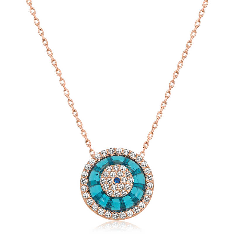 Şıklığınıza şıklık katacak ışıl ışıl gümüş cam göz bayan kolye modeli, siz güzel kadınlar için tasarladık. Bu muhteşem setle dikkatleri üzerinize çekeceksiniz. Camgöz rose nazar kolye modeli 925 ayar gümüştür. Gümüş üzerine rodyum kaplama yapılmıştır. Rodyum kaplama yapılan gümüş bayan kolye modelleri parlaklığını uzun süre muhafaza eder. Zirkon taşların cam taşı ile uyumundan faydalanılarak tasarlanmış ürün, ayrıca gümüş madeninin tüm yararlı etkilerini teninizden direk olarak almanızı sağlayacaktır. Camgöz nazar kolye; yılbaşı, anneler günü, özel günler ve sevgililer için uygun ve güzel bir hediye seçeneğidir. Tüm gümüş kolye modellerinde olduğu gibi gümüş camgöz nazar kolye modeli de el emeği ile üretilmiştir. Gümüş ve değerli taşlar nedeniyle belirtilen ortalama ürün ağırlığında ± %10 sapma olabilmektedir.