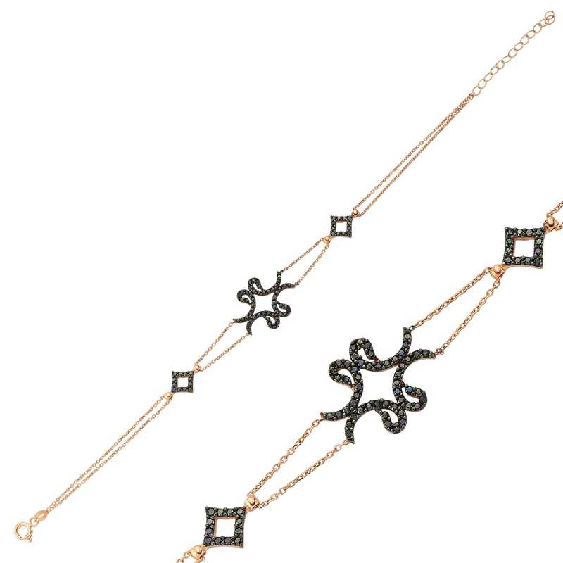 Mükemmel bir tasarıma sahip bu vav desenli bayan bileklik modeli 925 ayar gümüşten imal edilmiştir. Gümüş üzerine rose altın kaplama yapılmıştır. Rose altın kaplama yapılan tüm bayan bileklik modelleri parlaklığını uzun süre muhafaza eder ve oksitlenmesi gecikir. Üzerinde dört vav bulunan bu gümüş bayan bilekliğin taşları zirkondur. Bileklik uzunluğu bilek kalınlığına göre ayarlanabilmesini sağlayan uzatma zinciri vardır. En fazla 20 cm’ye kadar uzayabilir. Bütün bayan bileklik modelleri el emeği ile üretilmiştir. Gümüş ve değerli taşlar nedeniyle belirtilen ortalama ürün ağırlığında ± %10 sapma olabilmektedir.