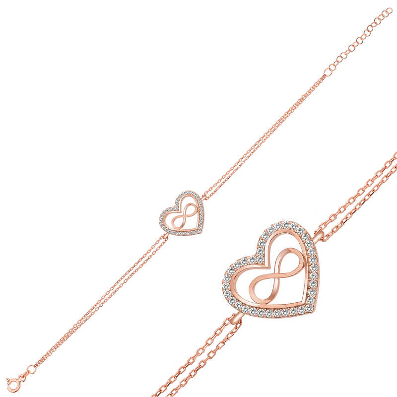 Gümüş zirkon taşlar ve sonsuzluk modelinin bir araya geldiği sevdiklerinize sevginizi gösterebileceğiniz şık ve anlamlı bir hediye olacaktır. Bu sonsuzluk model bileklik üzerine rose kaplama yapılmıştır. Rose kaplama yapılan gümüş bayan bileklik modelleri parlaklığını uzun süre muhafaza eder ve oksitlenmesi gecikir. Bayan bileklik modellerinin tamamında olduğu gibi gümüş sonsuzluk bayan bileklik modeli de el emeği ile üretilmiştir. Gümüş ve değerli taşlar nedeniyle belirtilen ortalama ürün ağırlığında ± %10 sapma olabilmektedir.