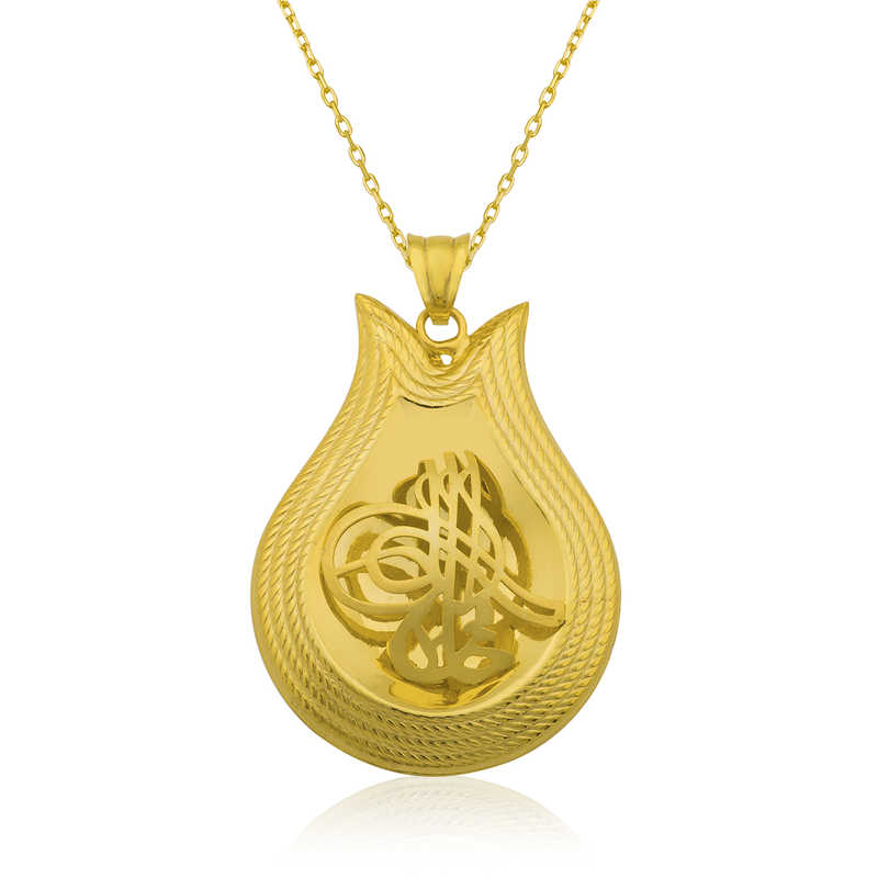 Tuğra, Osmanlı sultanlarının imzası anlamına gelir. Her tuğra; ona ait olan padişahın ismini, varlığını, hükümdarlığını ifade eder. Tuğra sembolü her padişaha göre farklı olmak üzere birçok şekilde günümüze ulaşmıştır. Tuğra Osmanlının her döneminde korunmuş, önemini hiç kaybetmemiştir. Ve zamanla hat sanatımızda da önemli bir yere sahip olup, günümüzde hattatlar tarafından sanatsal olarak yaşatılmaktadır. Bu mükemmel kolyeyi; doğum günü hediyesi, sevgililer günü hediyesi veya annelere hediye olarak özel günlerde tercih edebilirsiniz. Sarı tuğra bayan kolye 925 ayar gümüşten imal edilmiştir. Gümüş üzerine altın kaplama yapılmıştır. Altın kaplama yapılan kolyeler parlaklığını uzun süre muhafaza eder, gümüş rengini sarı renge dönüştürür ve oksitlenmeyi geciktirir. Üzerinde bulunan beyaz taşlar zirkondur. Tüm gümüş kolyelerde olduğu gibi gümüş sarı tuğra kolye de el emeği ile üretilmiştir. Gümüş ve değerli taşlar nedeniyle belirtilen ürün ağırlığında ± %10 sapma olabilmektedir.