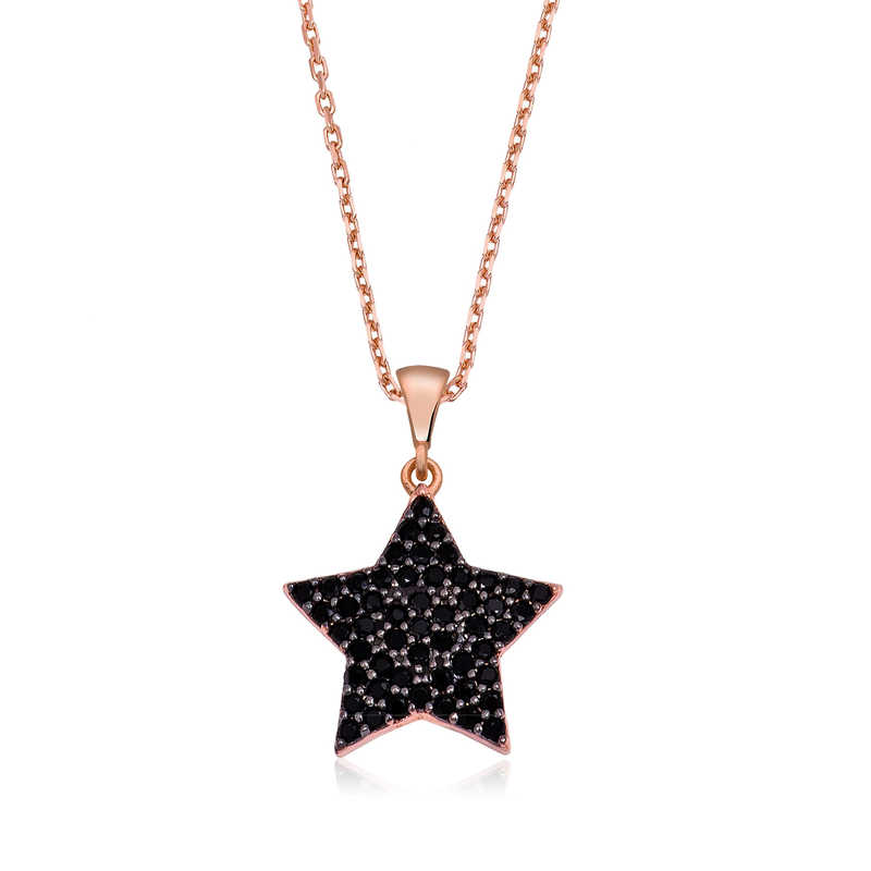 Gecenin parlak ışıltısını anımsatan yıldız, sembolik olarak evrenin sonsuzluğunu, uzaktaki bir noktayı ifade eder. Parıltının, ışığın, aydınlığın ve umudun sembolüdür. Her insan özel, her sevilen eşsizdir. Eşsiz sevginin ömür boyu sürecek birlikteliğin simgesi gümüş yıldız kolye ile sevdiklerinizi mutlu etmeye ne dersiniz... Kolye 925 ayar gümüşten imal edilmiştir. Gümüş üzerine rose kaplama yapılmıştır. Rose kaplama yapılan ürünler parlaklığını uzun süre muhafaza eder, gümüş rengini pembe renge dönüştürür ve oksitlenmeyi geciktirir. Üzerinde bulunan siyah taşlar zirkondur. Gümüş kolye modellerinin tamamında olduğu gibi gümüş siyah yıldız kolye modeli de el emeği ile üretilmiştir. Gümüş ve değerli taşlar nedeniyle belirtilen ortalama ürün ağırlığında ± %10 sapma olabilmektedir.