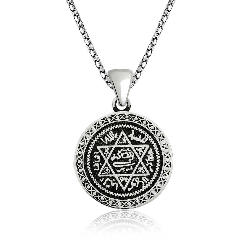 Davud yıldızı veya altı köşeli yıldız olarak da bilinen Süleyman mührünün hikmetlerini saymakla bitiremeyiz. Mührü yanında taşıyan kişiye büyü etki etmez. Kişi her türlü nazardan korunur. Taşıyan kişiye şeytan ve türevlerinin etki etmemesi gibi pek çok şifası vardır. Kolye 925 ayar gümüşten imal edilmiştir. Gümüş üzerine oksit kaplama yapılmıştır. Oksit kaplama yapılan gümüş kolyeler parlaklığını uzun süre muhafaza eder. Tüm gümüş kolyelerde olduğu gibi gümüş Süleyman mührü kolye de el emeği ile üretilmiştir. Gümüş ve değerli taşlar nedeniyle belirtilen ortalama ürün ağırlığında ± %10 sapma olabilmektedir.