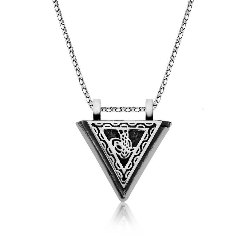Tuğra, Osmanlı sultanlarının imzası anlamına gelir. Her tuğra; ona ait olan padişahın ismini, varlığını, hükümdarlığını ifade eder. Tuğra sembolü her padişaha göre farklı olmak üzere birçok şekilde günümüze ulaşmıştır. Tuğra Osmanlının her döneminde korunmuş, önemini hiç kaybetmemiştir. Ve zamanla hat sanatımızda da önemli bir yere sahip olup, günümüzde hattatlar tarafından sanatsal olarak yaşatılmaktadır. Bu maneviyatla oluşturulan erkek kolye; 925 ayar gümüşten imal edilmiştir. Kolye üzerine oksit kaplama yapılmıştır.Diğer gümüş kolyelerde olduğu gibi gümüş tuğralı muska erkek kolye de tamamı el emeği ile üretilmiştir. Gümüş ve değerli taşlar nedeniyle belirtilen ortalama ürün ağırlığında ± %10 sapma olabilmektedir.