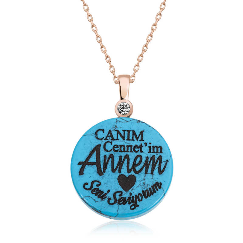 Hayatta en değerli varlığınız olan biricik anneniz için en güzel hediyeyi vermek istemeniz çok doğaldır. Çünkü anneniz sizin için hayatta ki en önemli varlıktır. Annenize duyduğunuz sonsuz sevginizi hissettirebileceğiniz bu özel kolye ile onu çok mutlu etmiş olacaksınız. Anneleri anmak ve onurlandırmak amacıyla tüm dünyada farklı zamanlarda kutlanan anneler gününde ona olan sevginizi bu anlamlı kolye ile gösterin. Gümüş turkuaz taşlı annem yazılı kadın kolye modeli 925 ayar gümüşten imal edilmiştir. Gümüş üzerine rose kaplama yapılmıştır. Rose kaplama yapılan gümüş kolye modelleri parlaklığını uzun süre muhafaza eder ve oksitlenmesi gecikir. Gümüş olan zincir boyu ortalama 45 cm'dir. Gümüş annem yazılı kadın kolye modeli el emeği ile üretilmiştir. Gümüş ve değerli taşlar nedeniyle belirtilen ürün ağırlığında ± %10 sapma olabilmektedir.