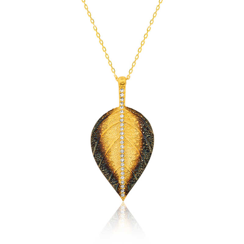 Gençlere ve kendisini genç hisseden tüm kadınlara özel; gümüş ve beyaz zirkon taşın ışıltısı ile yaşam enerjinizi etrafınıza yansıtın. Sizin olduğu kadar sevdiklerinizin de keyifle takacağı bu kolye modeli, sevdiğinize verilebilecek en güzel hediyelerden biri olacaktır. Bu yaprak desenli kolye 925 ayar gümüşten imal edilmiştir. Gümüş üzerine altın kaplama yapılmıştır. Altın kaplama yapılan gümüş kolye modelleri parlaklığını uzun süre muhafaza eder ve oksitlenmesi gecikir. Gümüş kolye üzerinde bulunan taşlar zirkondur. Gümüş olan zincirin boyu ortalama 45 cm'dir. Tüm gümüş kolye modellerinde olduğu gibi bu gümüş yaprak kolye modeli de el emeği ile üretilmiştir. Gümüş ve değerli taşlar nedeniyle belirtilen ortlama ürün ağırlığında ± %10 sapma olabilmektedir.