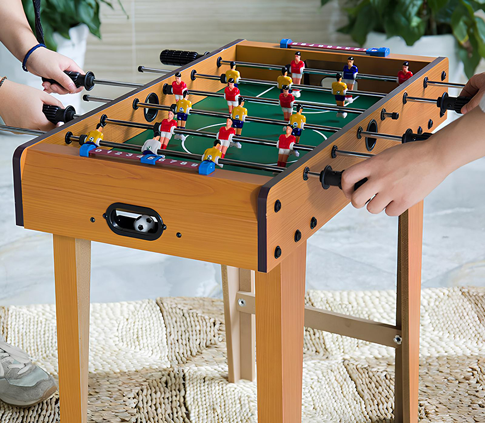 Ahşap Ayaklı Langırt Oyunu, klasik langırt keyfini daha konforlu ve gerçekçi bir deneyimle sunan, ayaklı tasarımı sayesinde masa gerektirmeden kullanılabilen eğlenceli bir oyun setidir. 70x60 cm ölçüsü ile hem çocuklar hem de yetişkinler için ideal bir oyun alanı sunar. Sağlam ahşap gövdesi ve dengeli ayak yapısı sayesinde oyun sırasında sarsılma yapmaz ve uzun süreli kullanımlarda formunu korur. Metal çubuklar üzerinde yer alan oyuncu figürleri akıcı hareket kabiliyeti sağlayarak hızlı ve kontrollü oyun imkânı sunar. Ergonomik tutma kolları sayesinde rahat kavrama sağlanırken, ev ortamlarında, oyun odalarında, kafe ve sosyal alanlarda keyifle kullanılabilecek bir üründür. Kurulumu kolay olan yapısı sayesinde kısa sürede kullanıma hazır hale gelir ve arkadaş gruplarıyla rekabet dolu maçlar yapmak için idealdir.