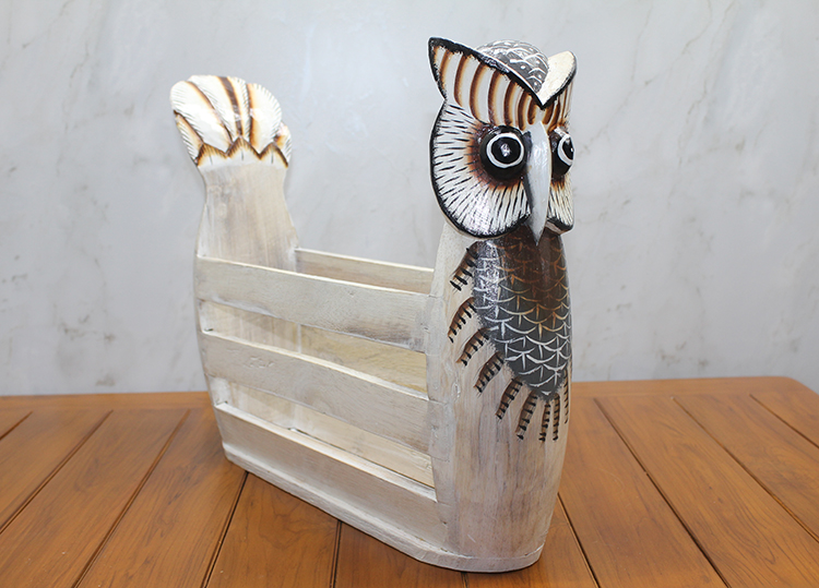 Ahşap Baykuş Gazetelik AHŞAP BAYKUŞ GAZETELİK Ürün Özellikleri Doğal ahşaptan üretilen baykuş figürlü gazetelik, 33x43 cm boyutundadır. Estetik ve dekoratif tasarımıyla gazete, dergi ve kitaplarınızı düzenli bir şekilde saklamanızı sağlar. El işçiliğiyle özenle hazırlanmış olan bu ürün, ev ve ofis dekorasyonuna şık bir dokunuş katar. Ahşap dokusu sayesinde uzun ömürlü ve dayanıklı bir kullanım sunar. Paket İçeriği 1 adet ahşap baykuş gazetelik.
