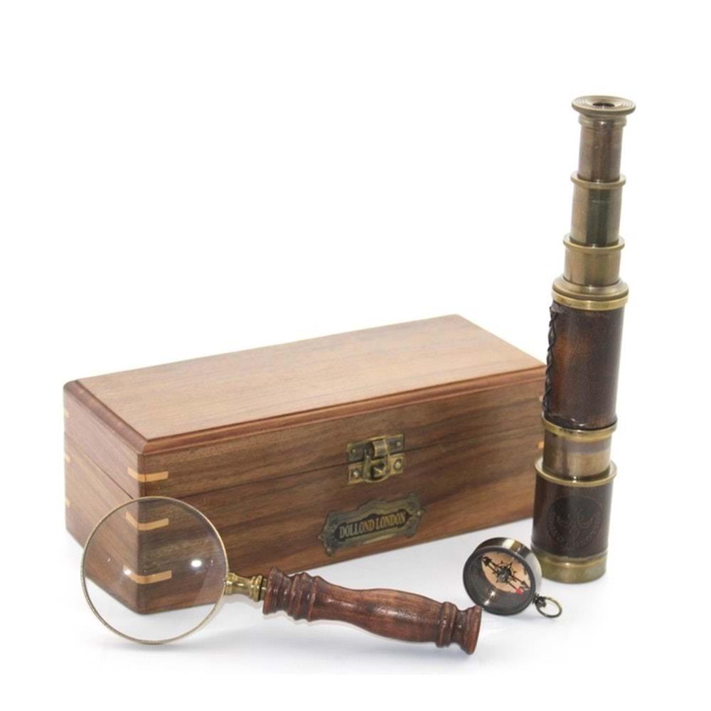 Ahşap Kutu Pirinç Pusula Dürbün Büyüteç Seti