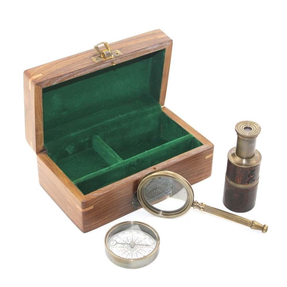 Ahşap Kutu Pirinç Pusula Dürbün Büyüteç Seti