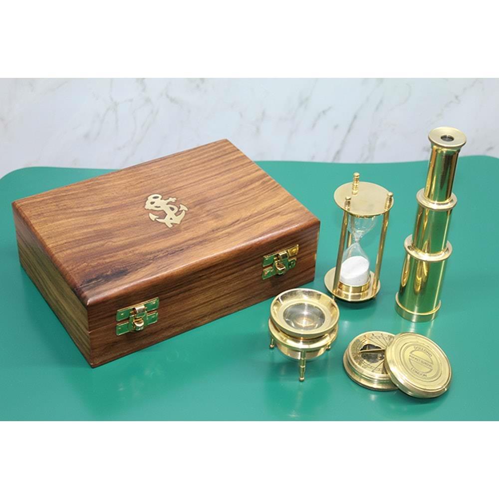 Ahşap Kutulu Dürbün Kumsaati Büyüteç Pusula Seti