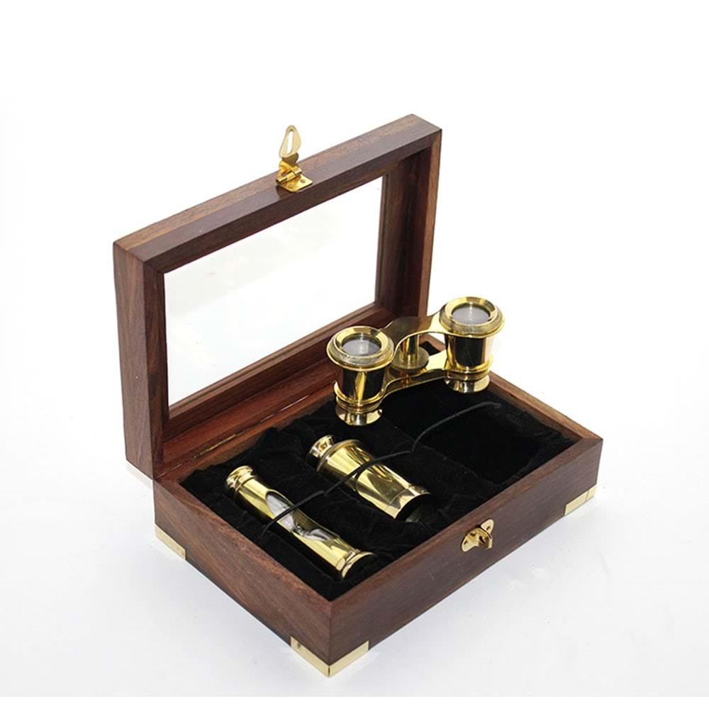 Ahşap Kutulu Pirinç Kumsaati Ve Dürbün Seti