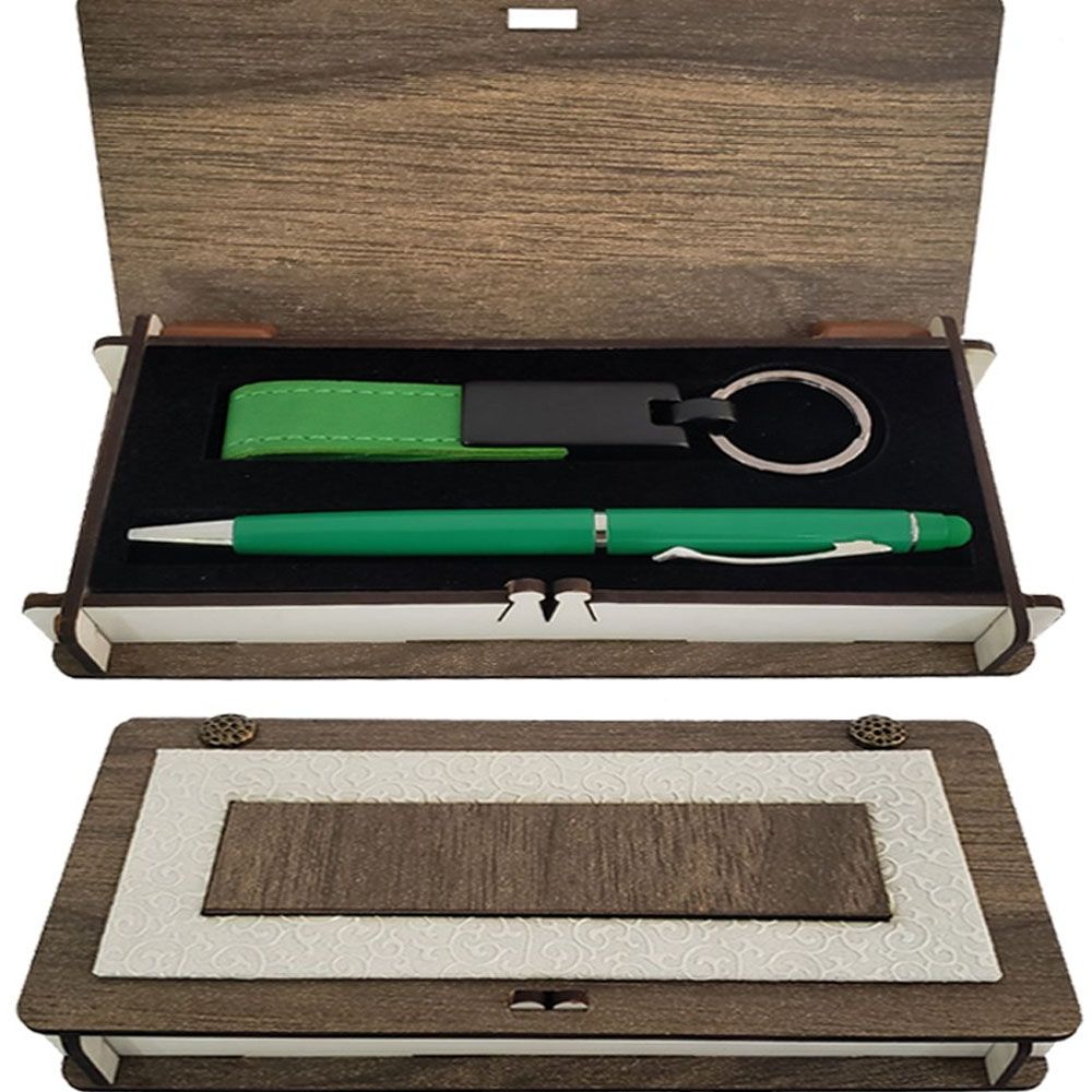 Ahşap Kutulu Yeşil Anahtarlık Ve Kalem Set
