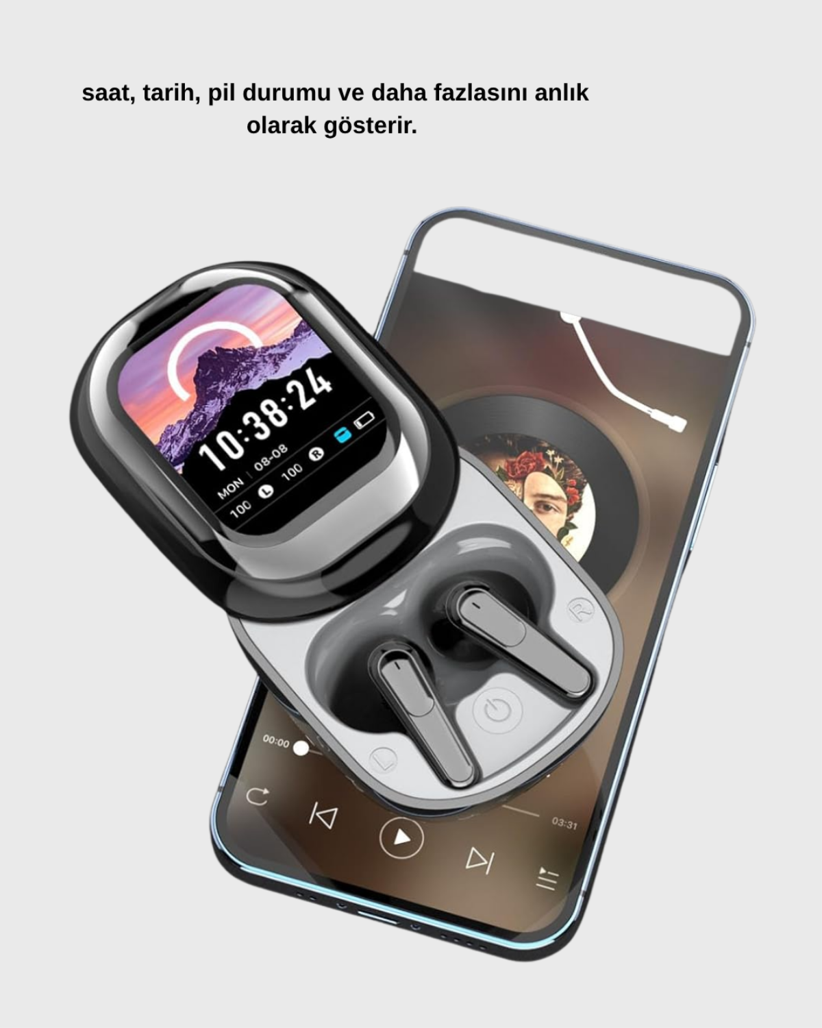 Akıllı ekranlı şarj kutusu sayesinde kulaklık pil seviyesini, şarj süresini ve müzik kontrolünü tek bir dokunuşla yönetebilirsiniz.