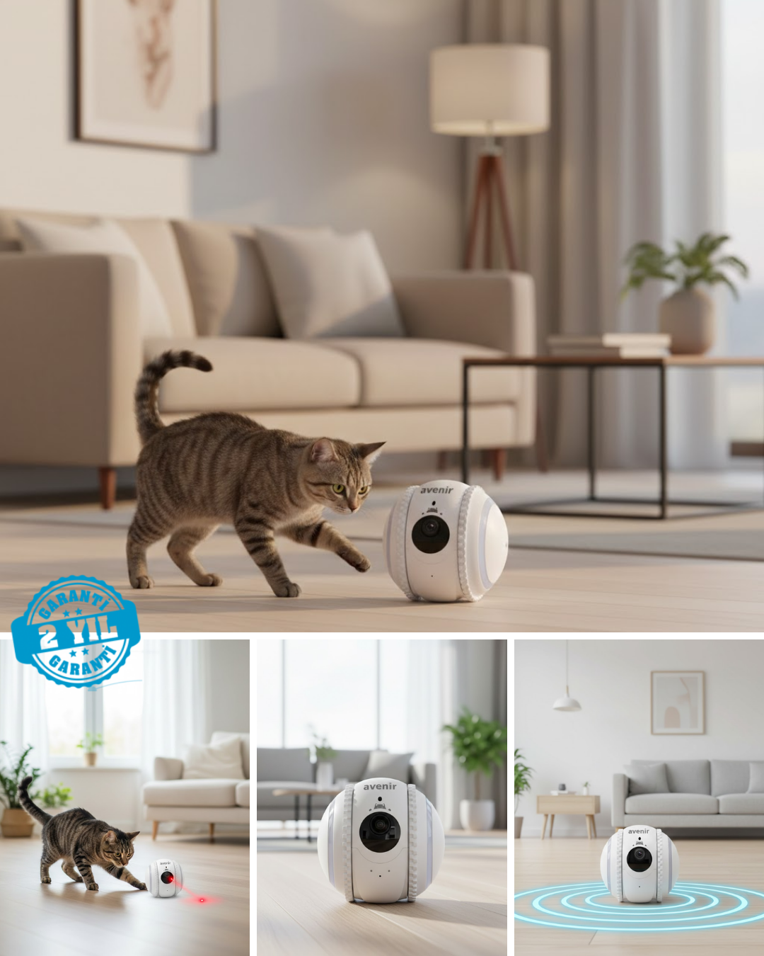 Evcil hayvanlar için özel olarak geliştirilen eğlence modları sayesinde 9 farklı evcil hayvan dostu ses efekti ve 5 otomatik aktivite ile hayvanlarınızın gün boyunca aktif ve mutlu kalmasını sağlayabilirsiniz. Etkileşimli lazer özelliği ile uzaktan oyun oynayabilir, ortam ışığı ve takılabilir oyun çubuğu ile eğlenceyi artırabilirsiniz.