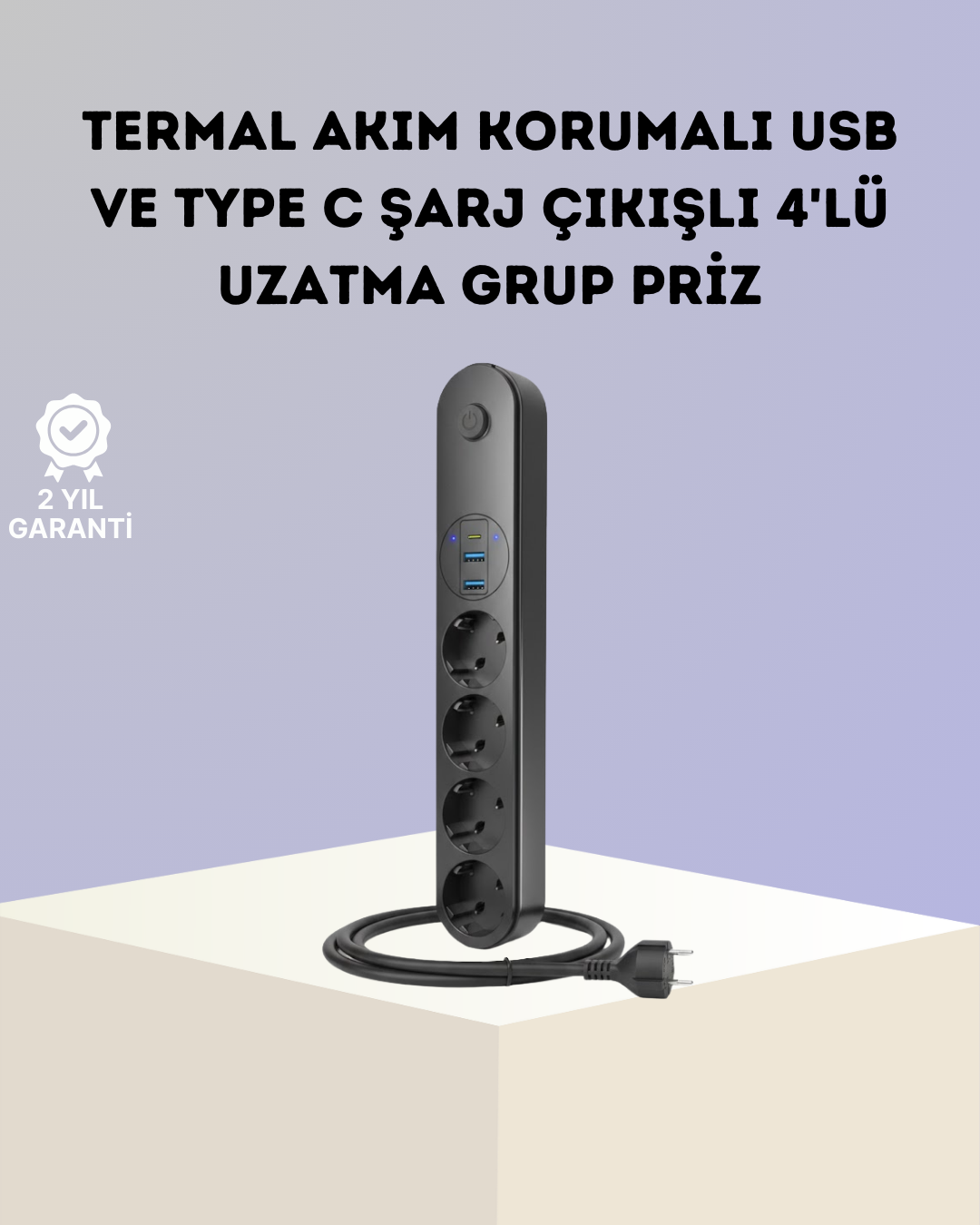 4 prizli akım korumalı çoklu priz, modern yaşamın artan enerji ve bağlantı ihtiyaçlarına pratik bir çözüm sunar. 2 USB ve 1 Type-C çıkışı sayesinde telefon, tablet ve diğer taşınabilir cihazlarınızı ek adaptöre gerek kalmadan şarj edebilirsiniz. 2500 Joule maksimum koruma kapasitesi ile cihazlarınızı ani voltaj dalgalanmalarına karşı güvence altına alır.