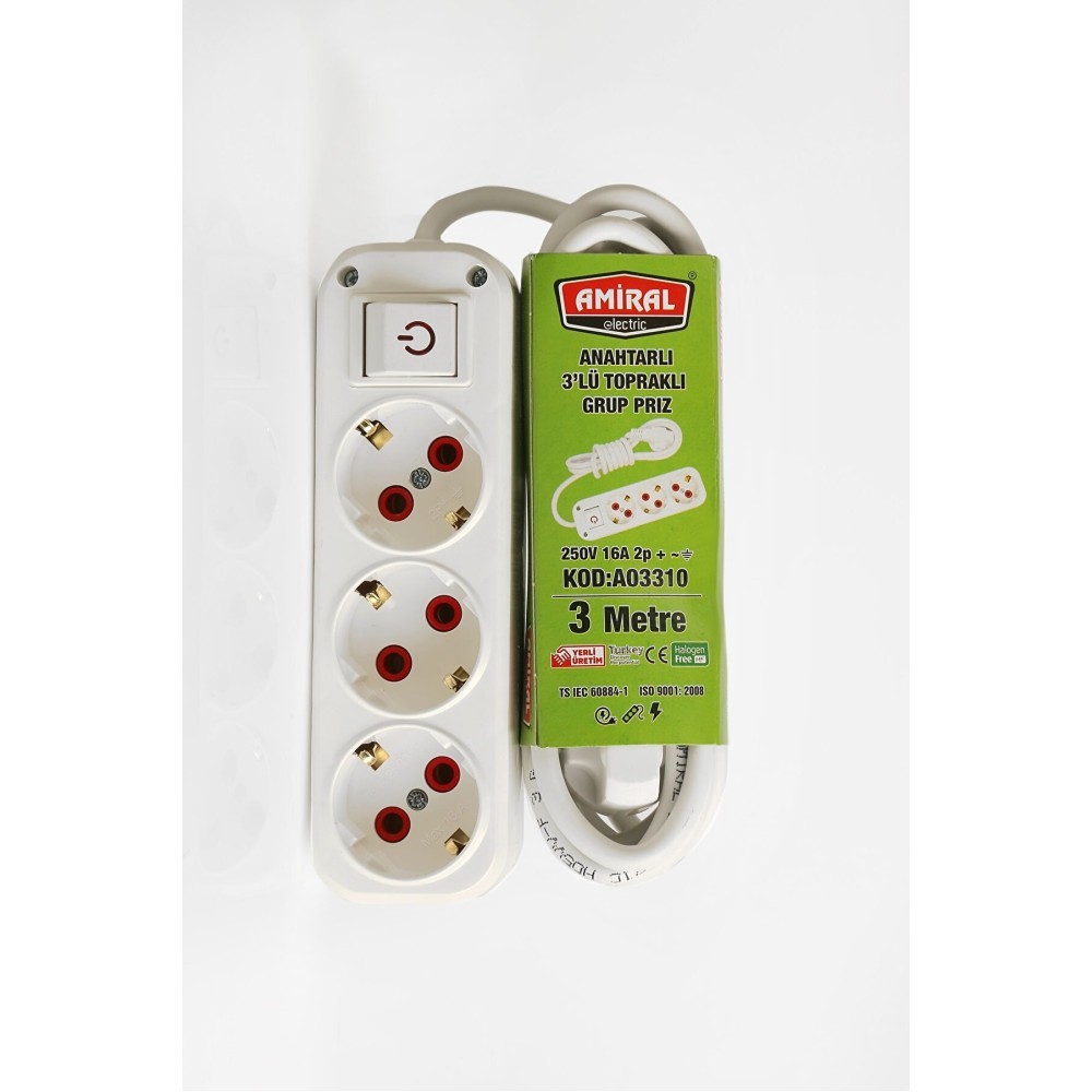 Amiral 3' lü Topraklı Anahtarlı 3 Metre Kablolu Grup Priz