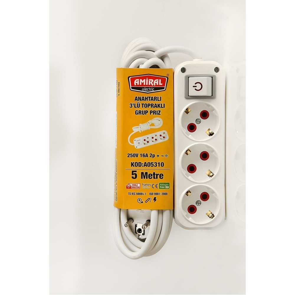 Amiral 3' lü Topraklı Anahtarlı 5 Metre Kablolu Grup Priz