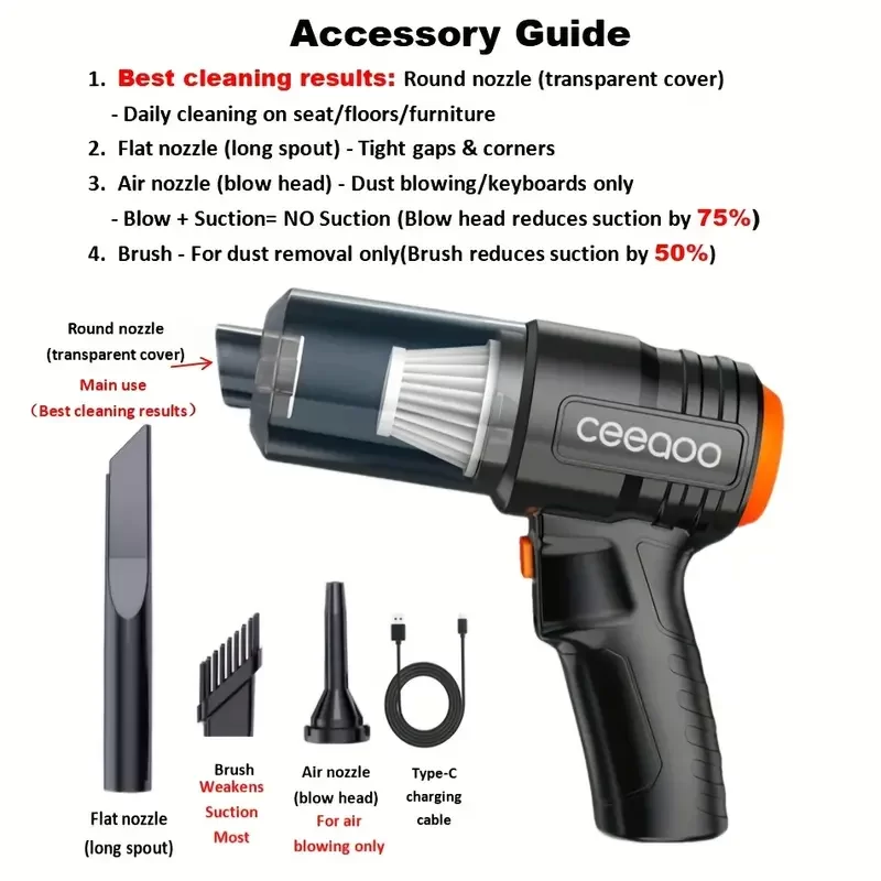 El Tipi Elektrikli Süpürge - Yüksek Emiş Gücü, Taşınabilir, Hafif, Aralık Aracı Dahil - Ev, Araba Temizliği, Evcil Hayvan Tüyleri ve Artıkların Giderilmesi İçin Mükemmel - USB Şarj Edilebilir, ABS Malzeme, Lityum-Polimer Pil, Taşınabilir Temizlik Cihazı
