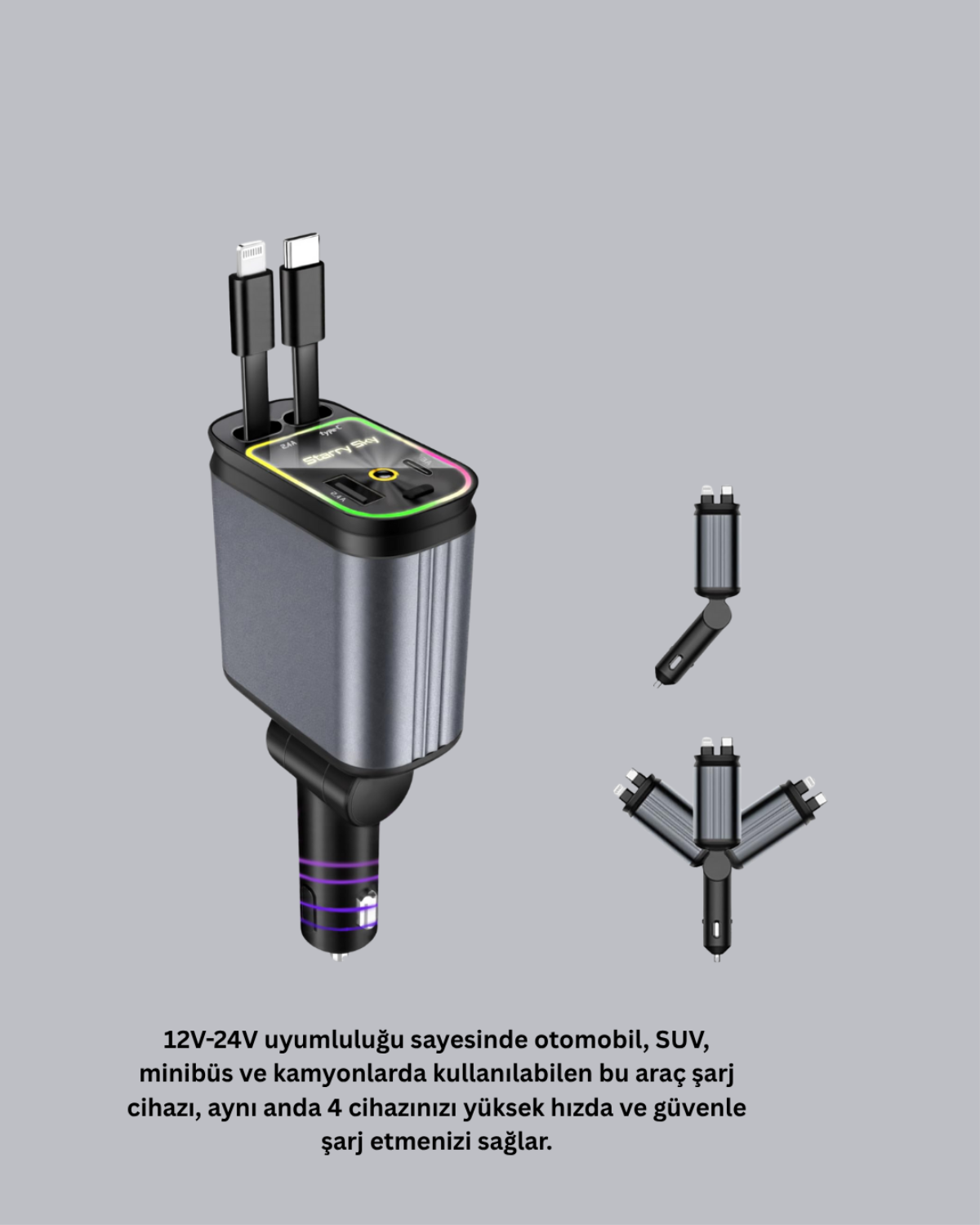 Şık tasarımı, yüksek performansı ve pratik özellikleriyle Araç Şarj Cihazı 66W 4 Portlu Hızlı Şarj ve LED Işıklı, her yolculukta vazgeçilmez bir yardımcıdır!