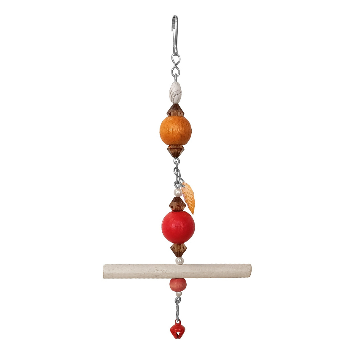 Askılı ve iri renkli boncuklu kuş kafes oyuncağıdır. Renkli çubuk ahşap tüneği ve boncuklarla özel olarak üretilmiş. Alt kısmına takılan çan aksesuarı ile gagalama esnasında ses çıkaracak böylece gagalama isteğinide gidermiş olacaktır. Üst kısmındaki kolayca asılabilecek aparatı ile kullanışlı şık bir kuş oyuncağıdır. Kuşlarınız bu oyuncaklarla hoş vakit geçirebilirler. Kuş kafes oyuncağı, canlı rekleri sayesinde kanatlı dostunuzun dikkatini kolayca çekebilecektir. Bu tür oyuncaklar zihinsel egzersiz oluşturması açısından yararli olup fiziksel egzersize teşvik eder. Aynı zamanda farklı oyuncaklar kullanmak kuşun ilgisini çeker, bu sebeple dönem dönem oyuncak değişikliği yapılması kanatlı dostunuzun sıkılmasını ve bunalıma girmesini önleyecektir.
