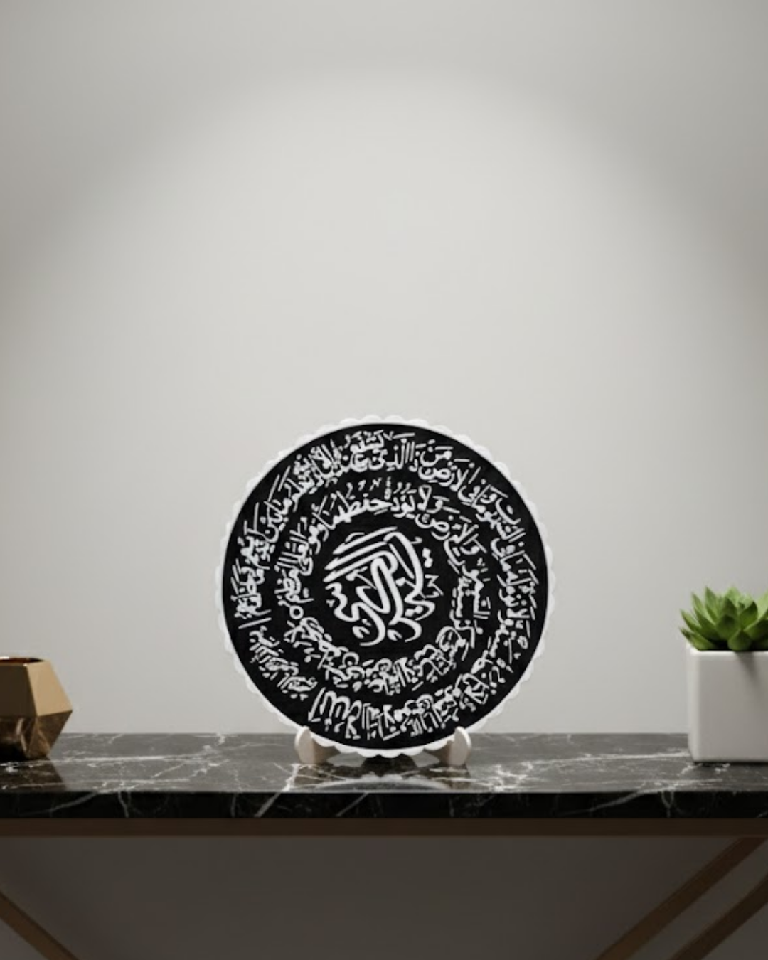 Bu dekoratif pano, Ayetel Kürsi’nin manevi anlamını estetik bir tasarım ile sunar. Siyah beyaz kontrast yapısı sayesinde modern dekorasyonlara uyum sağlar. Standlı yapısı sayesinde pratik kullanım sunar. Konsol, kitaplık ve masa üstünde rahatlıkla sergilenebilir. Hem dini hem dekoratif bir obje arayanlar için ideal bir tercihtir.