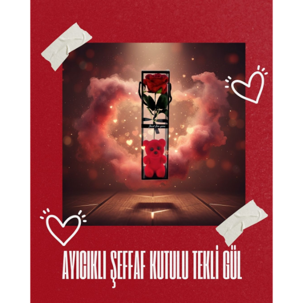 Şeffaf kutu, tekli gül ve ayıcık figürü
