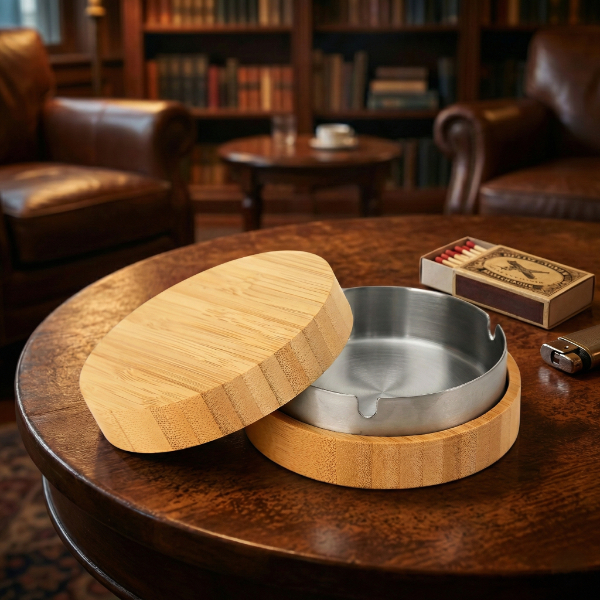 Bambu kapaklı küllük, modern ve doğal tasarımıyla iç ve dış mekân kullanımına uygun şık bir masa üstü aksesuarıdır. Ürünün alt gövdesinde yer alan metal küllük haznesi, sigara külü ve izmaritlerin güvenli şekilde toplanmasını sağlarken, bambu kapak hem estetik bir görünüm sunar hem de kullanılmadığı zamanlarda kül ve koku yayılımını azaltmaya yardımcı olur. Kapaklı yapısı sayesinde ortamın daha temiz ve düzenli görünmesini destekler. Küllük iç haznesinde yer alan sigara koyma kanalları, kullanım sırasında sigaranın sabit durmasını sağlar ve kül dökülmesini önler. Doğal bambu dokusu, ürüne sıcak ve dekoratif bir hava kazandırarak ev, ofis, balkon, teras, kafe ve restoran gibi birçok alanda rahatlıkla kullanılmasına imkân tanır. 4x11 cm kompakt ölçüsü sayesinde masa üzerinde fazla yer kaplamaz ve kolay taşınabilir yapıdadır. İç haznesi metal olduğu için temizlik işlemi pratik ve zahmetsiz şekilde yapılabilir. Hem dekoratif hem de fonksiyonel bir küllük arayan kullanıcılar için uzun ömürlü ve kullanışlı bir çözümdür.