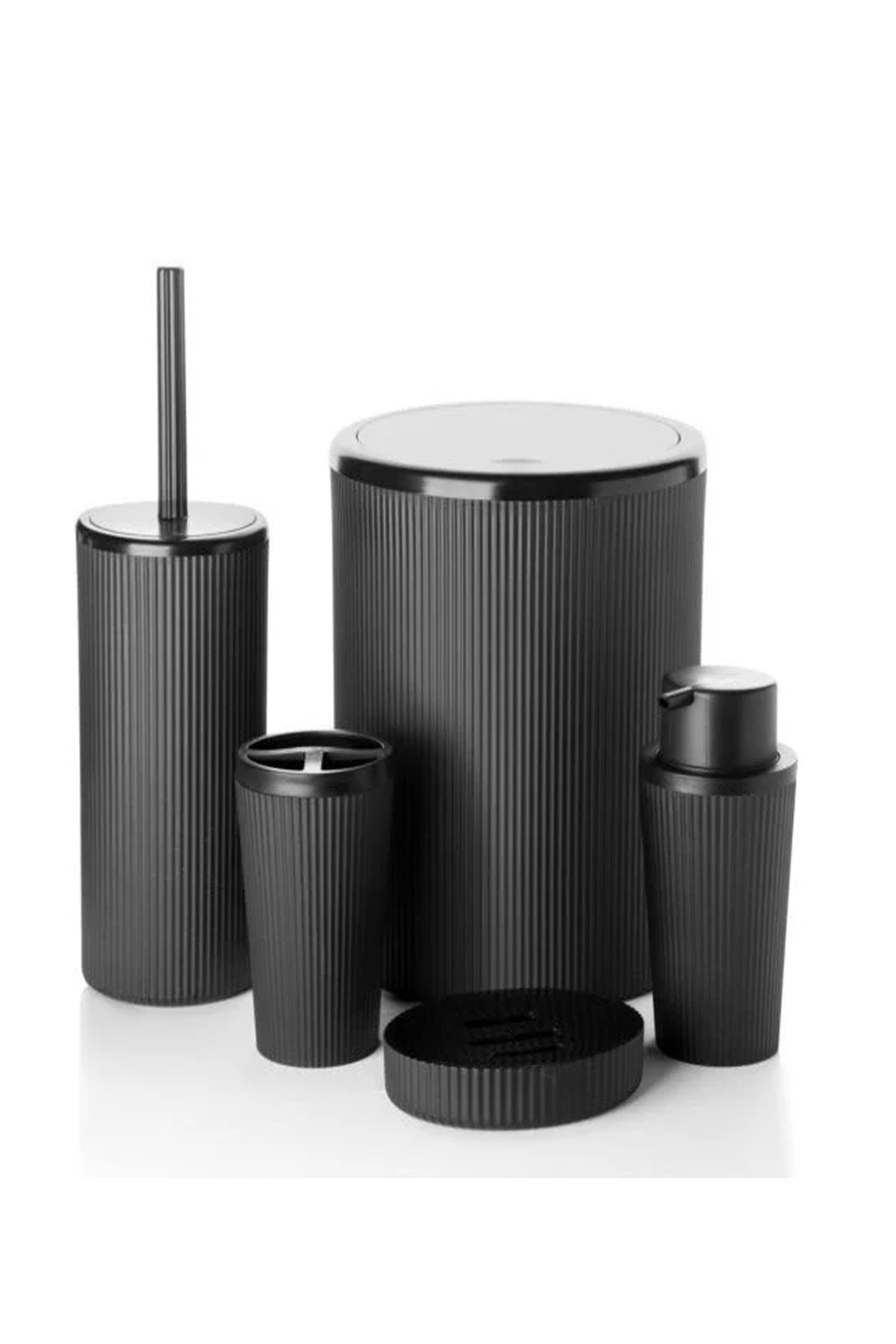 Paket İçeriği : 1 adet çöp kovası 1 adet diş fırçalık 1 adet sabunluk 1 adet sıvı sabunluk 1 adet tuvalet fırçası