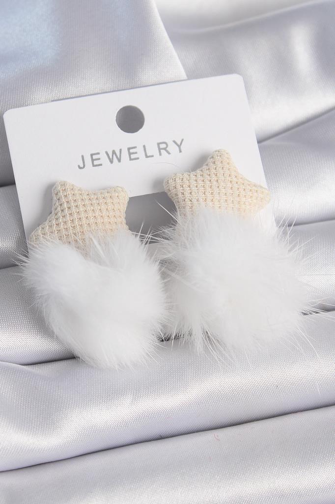Beyaz Renk Tüylü Yıldız Ponpon Model Kadın Küpe - TJ-BKP9557
